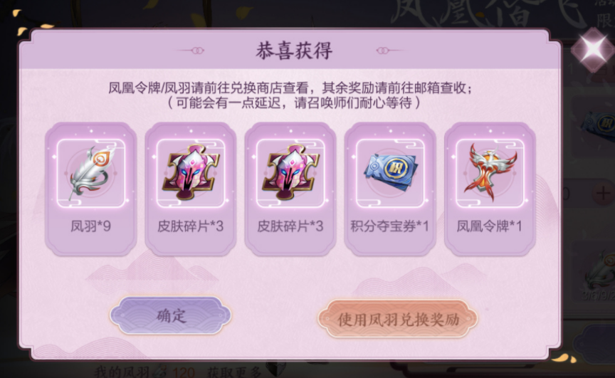 【凤凰令牌】和【凤羽】可以在兑换商店内兑换包括【凤凰于飞、凤求凰】皮肤在内的其他道具奖励,比如回城特效,或者击败特效,动作,或是皮肤碎片、皮肤点券抵扣卡等等。
