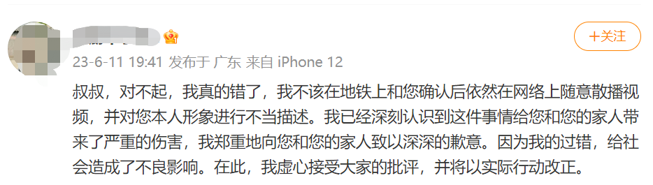 “曝光”地铁大叔的女孩道歉,希望她真能吸取教训