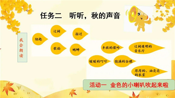 围绕单元主题,紧扣语文要素,三年级语文备课组设计了以“金色的秋天”为单元学习总任务情境,整合“四个任务、六个活动”进行学习,将识字写字、课内外阅读、习作、语文园地统整在“秋的日记”的主题情境中。学生通过朗读课文,了解课文内容,联系生活,在学习语言文字运用的过程中感受秋天别样的风景。