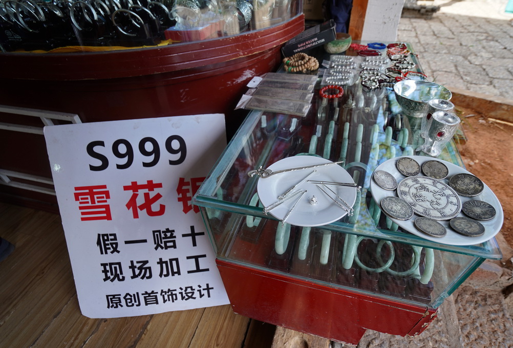 但很多银店只是进货的卖家,真正能自己加工的并不多,从摆放的工具就看得出来了。而鹤庆的银器加工已经成为产业,大部分是机械或半机械加工,成本不高。这里银器使用基本都是一种国内认可的999银材料,一克卖8-9元属于正常,但100元四只的手镯肯定不是这种材料了。